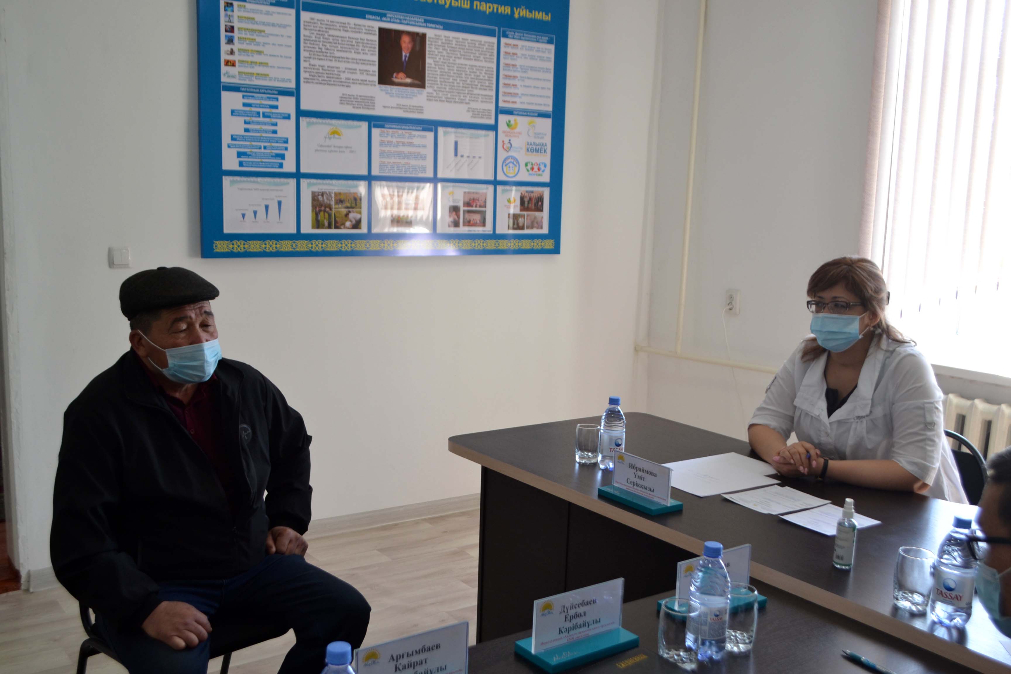 Қоғамдық қабылдауға аудандық орталық ауруханасының бас дәрігері Райқұл Нұржанов, «Халықты жұмыспен қамту орталығының» директоры Ербол Дүйсебаев, аудан әкімдігінің ТҮКШ және АЖ бөлімінің басшысы Қайрат Арғымбаев, «Сарымолдаев» бастауыш партия ұйымының төрайымы Үрияхан Мамикова, «Атамекен» Ұлттық кәсіпкерлер палатасы аудандық филиалының директоры Нұржан Шойбеков, партияның аудандық филиалы есеп және статистика секторының меңгерушісі Мәлік Нұрланов және т.б. қатысты.
