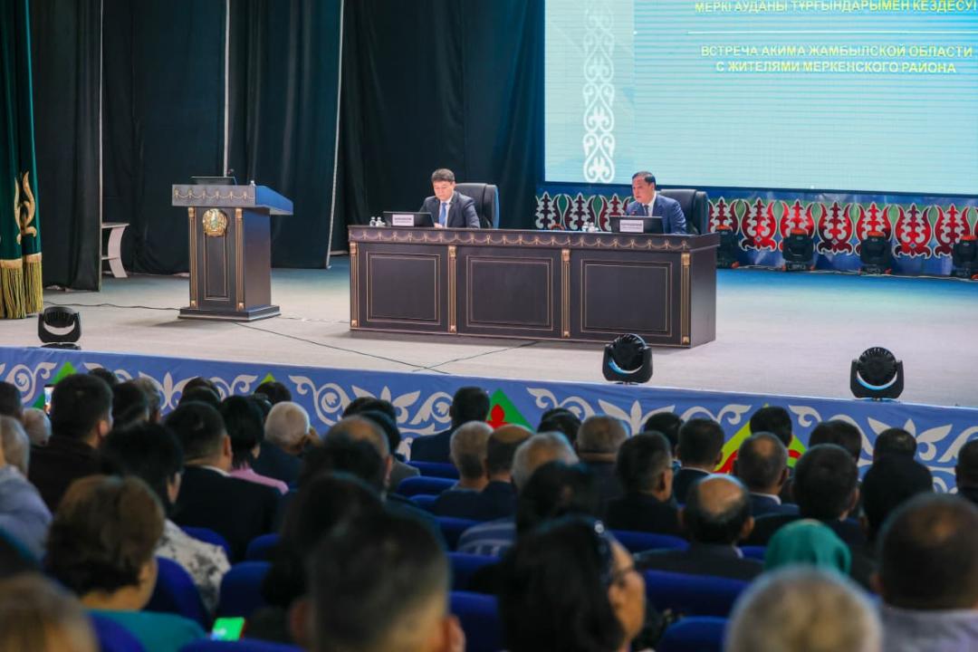 Меркі ауданының әкімі Ербол Жиенқұлов ауданның даму барысы жөнінде есеп беріп, халық сұрақтарына жауап берді. Ербол Қарашөкеев Меркі ауданы әкімдігіне халықтың тұрмыс сапасын жақсарту, жұмыс орындарын ашу, ауылшаруашылығы саласына жаңа технологиялар енгізу, құқықбұзушылықтың алдын алу және жол қауіпсіздігін күшейту жөнінде нақты тапсырмалар берді.