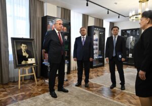 Қасым-Жомарт Тоқаевқа мектеп директоры Ләззат Испанова оқушылардың жетістіктері туралы айтып, жазушы мұражайымен таныстырды.