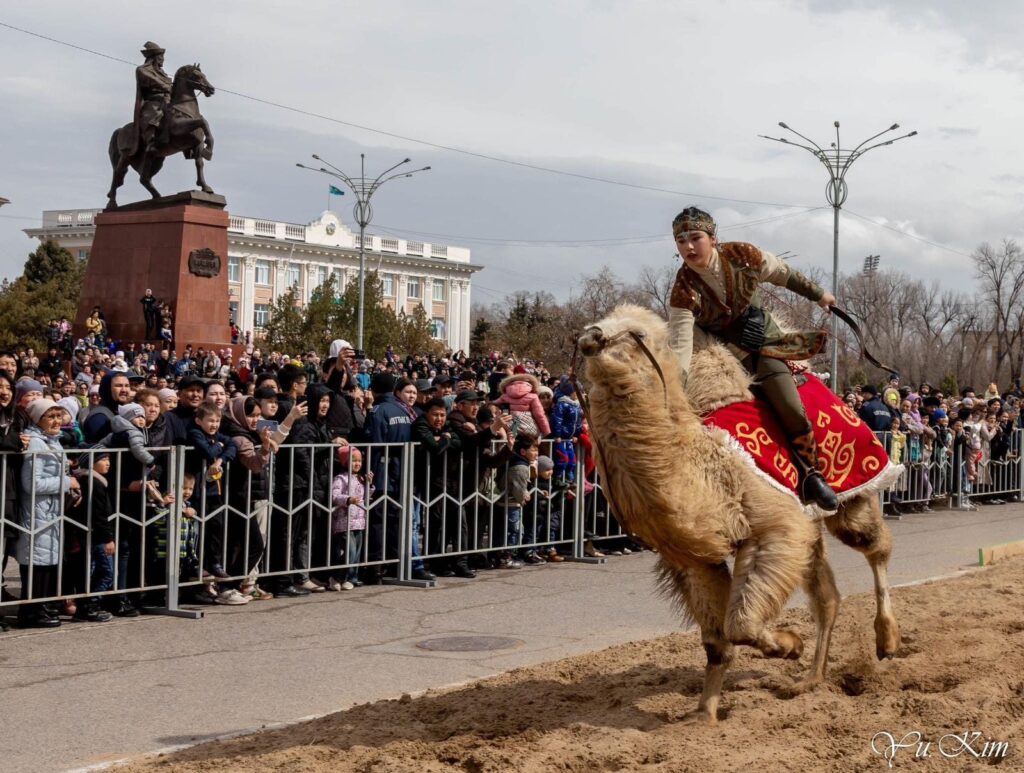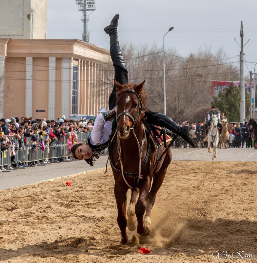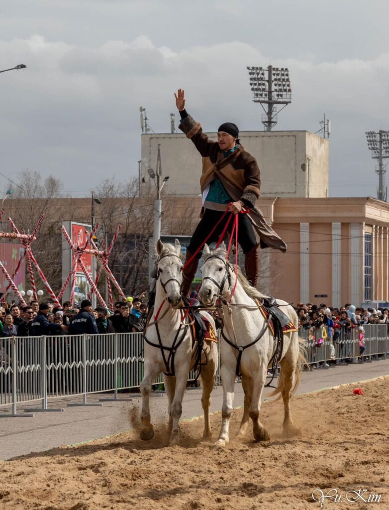 Бірер күнде-ақ, Орталық алаң — «Наурыз ауылына» айналып шыға келді. Кешегі Ұлттық спорт күнінде таң-тамашаны облыстың сахна жұлдыздарының әуездете шырқаған ән әуен ырғағымен ат құлағында ойнаған қыз-жігіттер көрсетті. Шауып бара жатқан сәйгүліктің үстінде мың бұрала билеп, тіпті аттың бауырына жабыса түскенді көргенде көрермен болып тұрған біздің жүрегіміз ұясынан шығып кете жаздады.