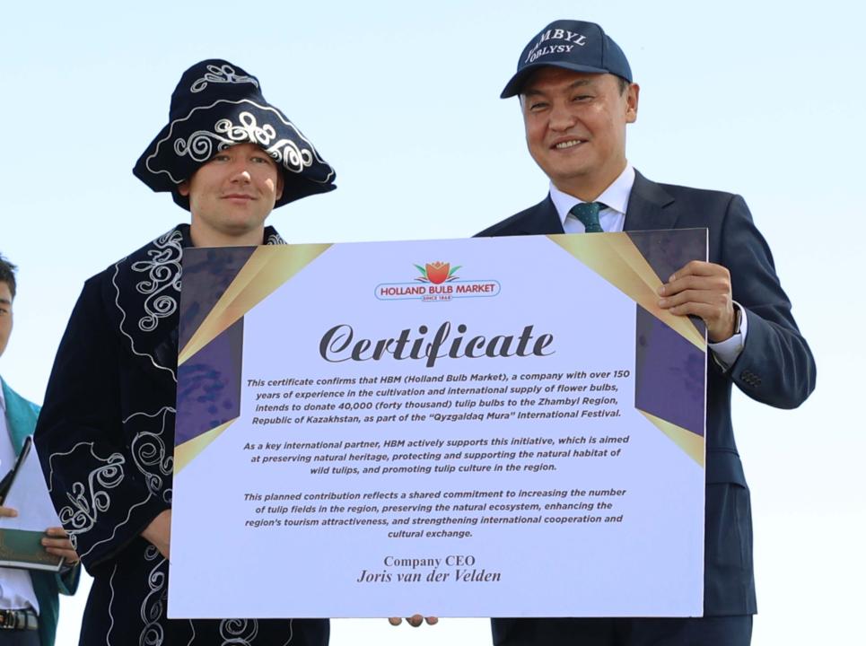Биылғы фестивальдің басты жаңалығы – Нидерланд Корольдігі тарапынан Жамбыл облысына 40 мың түп қызғалдақ тұқымын тарту етті. Құнды сыйлықты Holland Bulb Market компаниясының менеджері, Нидерланд елінің өкілі Марсели Пьехна салтанатты түрде табыстады.